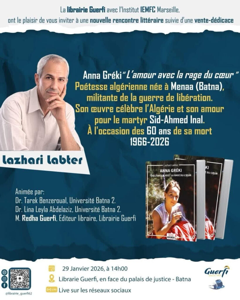 La librairie Guerfi de Batna accueillera, le 29 janvier 2026 à 14h, une rencontre littéraire suivie d’une vente-dédicace consacrée à l’ouvrage « Anna Gréki : L’amour avec la rage du cœur » de l’écrivain et chercheur Lazhari Labter. L’événement est organisé en collaboration avec l’Institut IEMFC Marseille.