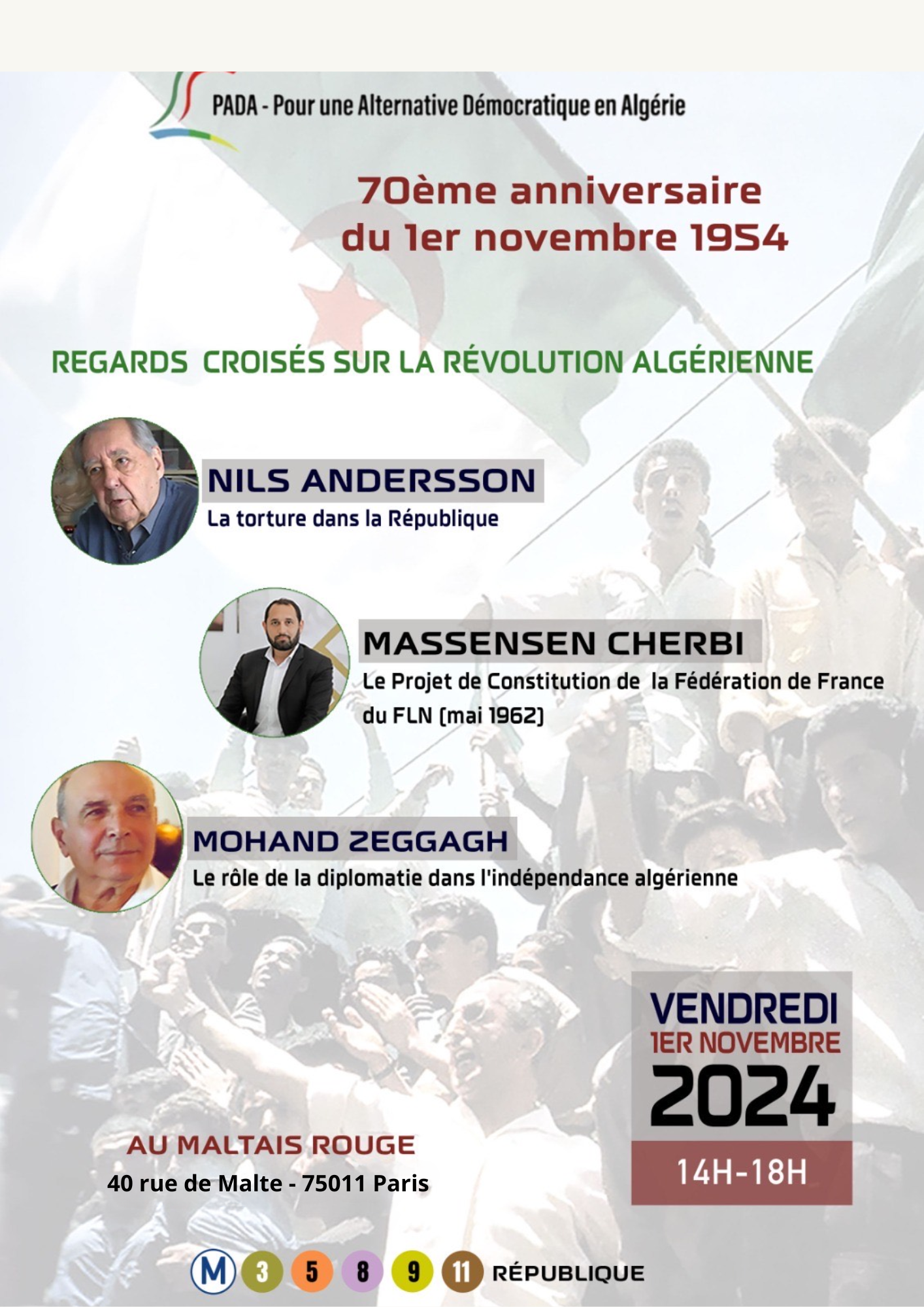 A l’occasion de la commémoration du 70e anniversaire du 1er novembre 1954, PADA (Pour une Alternative Démocratique en Algérie) organise une conférence au Maltais Rouge (Paris) avec :