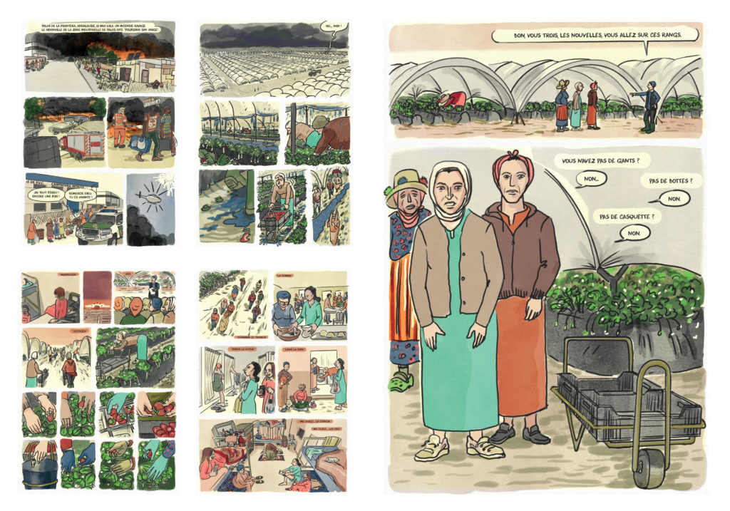 Dames de fraises, doigts de fée n’est pas seulement une bande dessinée : c’est un témoignage poignant et une immersion dans des vies souvent ignorées. Farida, Nadia et Najet quittent chaque année le Maroc, laissant derrière elles enfants, foyers et souvenirs, pour travailler quelques mois dans les champs de fraises de Huelva, en Andalousie.