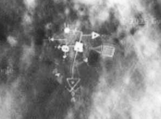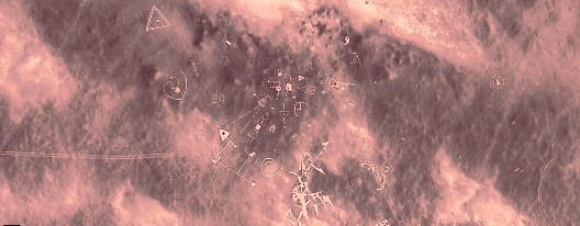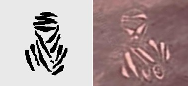 Un motif proche d’un sticker du Rally de Dakar couramment visible sur les 4×4 sahariens (coordonnées : 28°09’58″N, 2°38’34″E) ;