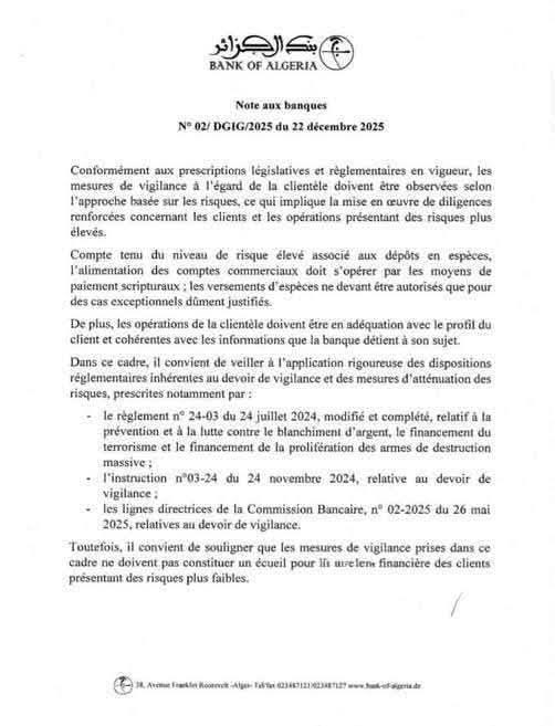 La Banque d’Algérie poursuit le renforcement de son dispositif de contrôle des flux financiers. Dans une note récemment adressée aux banques et établissements financiers, l’autorité monétaire appelle à une vigilance accrue, en particulier sur les dépôts d’espèces effectués par les entreprises.