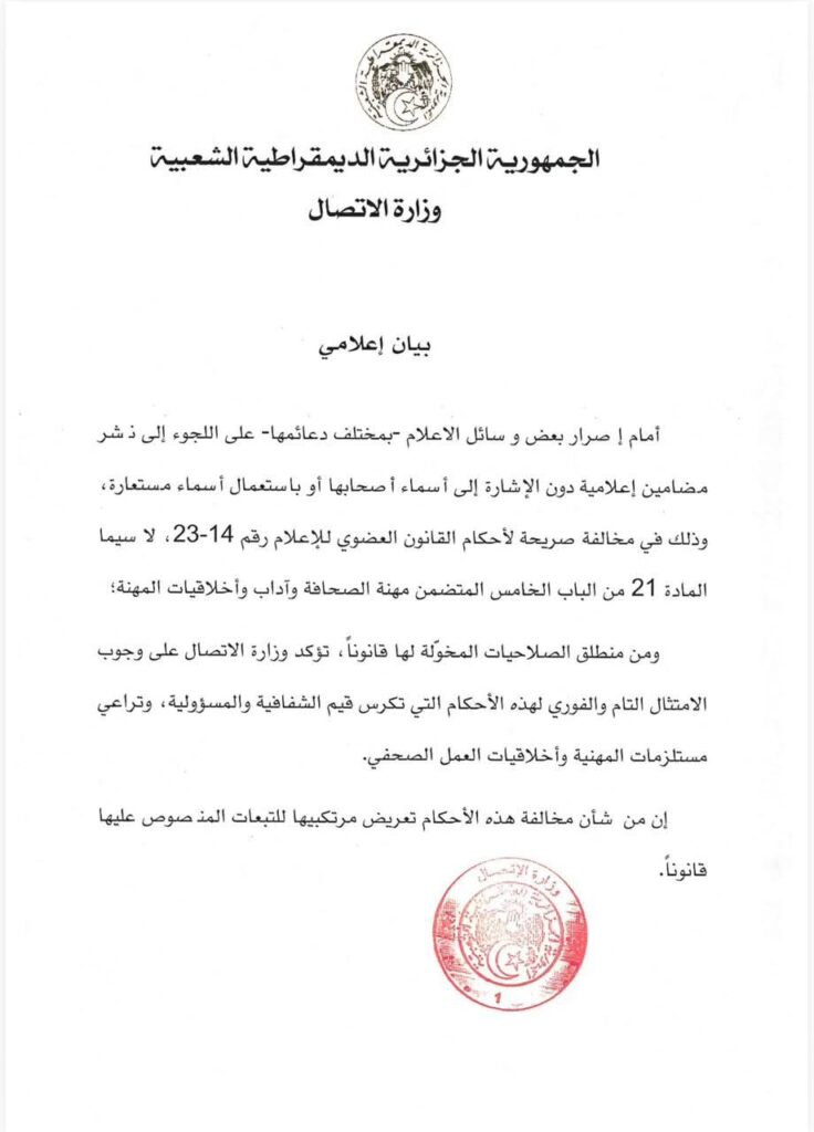 Cette injonction s’appuie sur les dispositions de la loi organique n°14-23 relative à l’information, notamment l’article 21 du chapitre consacré à la profession de journaliste et à l’éthique du métier. Un tantinet donneur de leçons, le ministère invoque la nécessité de garantir la transparence, la responsabilité éditoriale et le respect des règles déontologiques, tout en mettant en garde contre les sanctions prévues en cas de non-conformité.