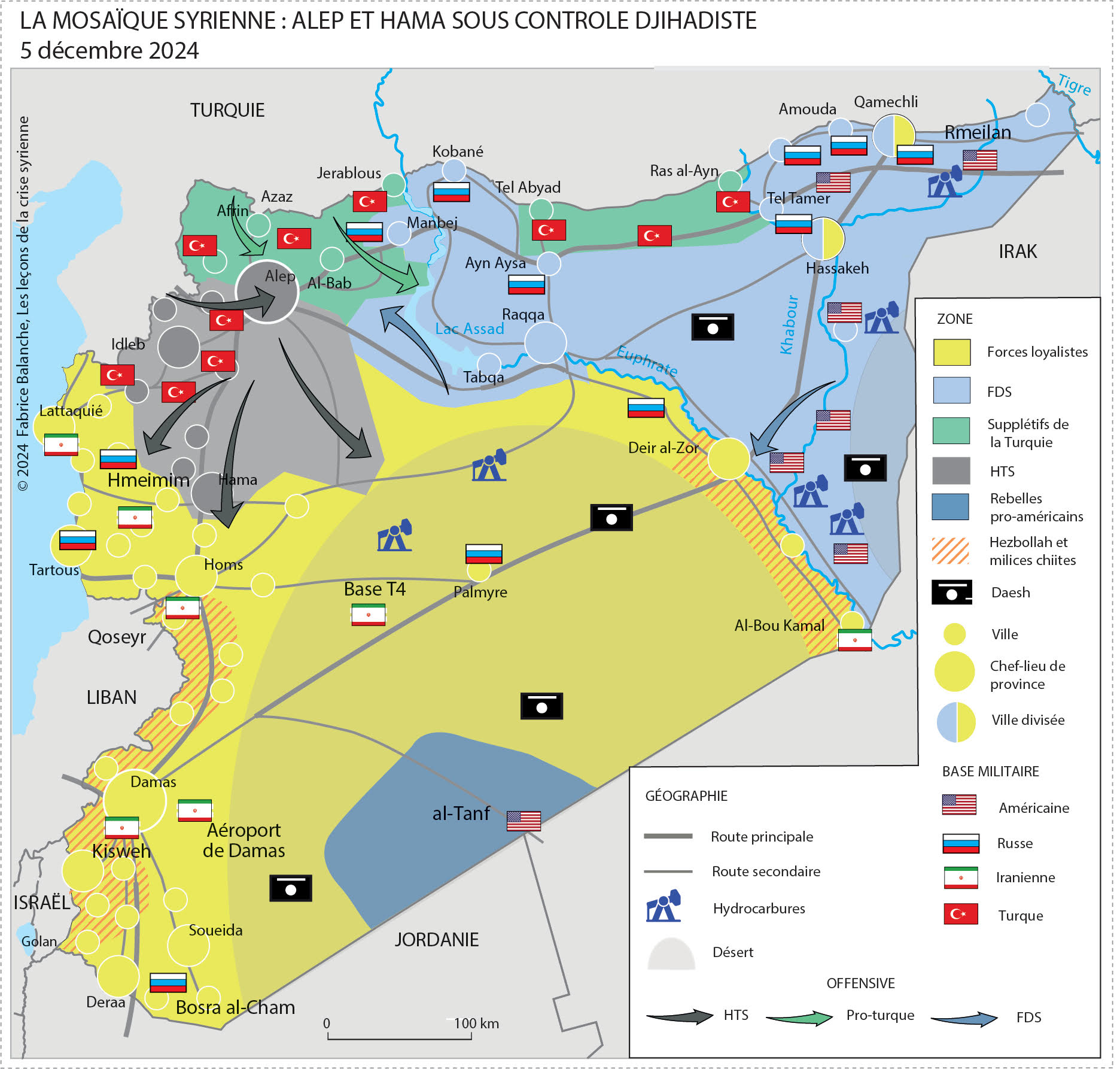 Jusqu’au 27 novembre dernier, il y a une semaine, la coalition de rebelle menée par le groupe islamiste Hayat Tahrir al-Sham était contenu à la province d’Idlib, avec elle de nombreux déplacés qui avaient fui la reprise de contrôle par le régime d’une grande partir du pays en 2016. En une semaine donc, cette coalition a fait reculer le régime et pris le contrôle de la région d’Alep pour continuer ensuite vers le sud et entrer jeudi dans Hama. Deux des quatre plus grandes villes de Syrie, toutes les deux sur la route de Damas.